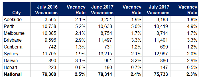 Data released by SQM Research this week has revealed the number of national residential vacancies was 75,733 homes in July 2017, giving a national vacancy rate of 2.3%, down from 2.4% in June.