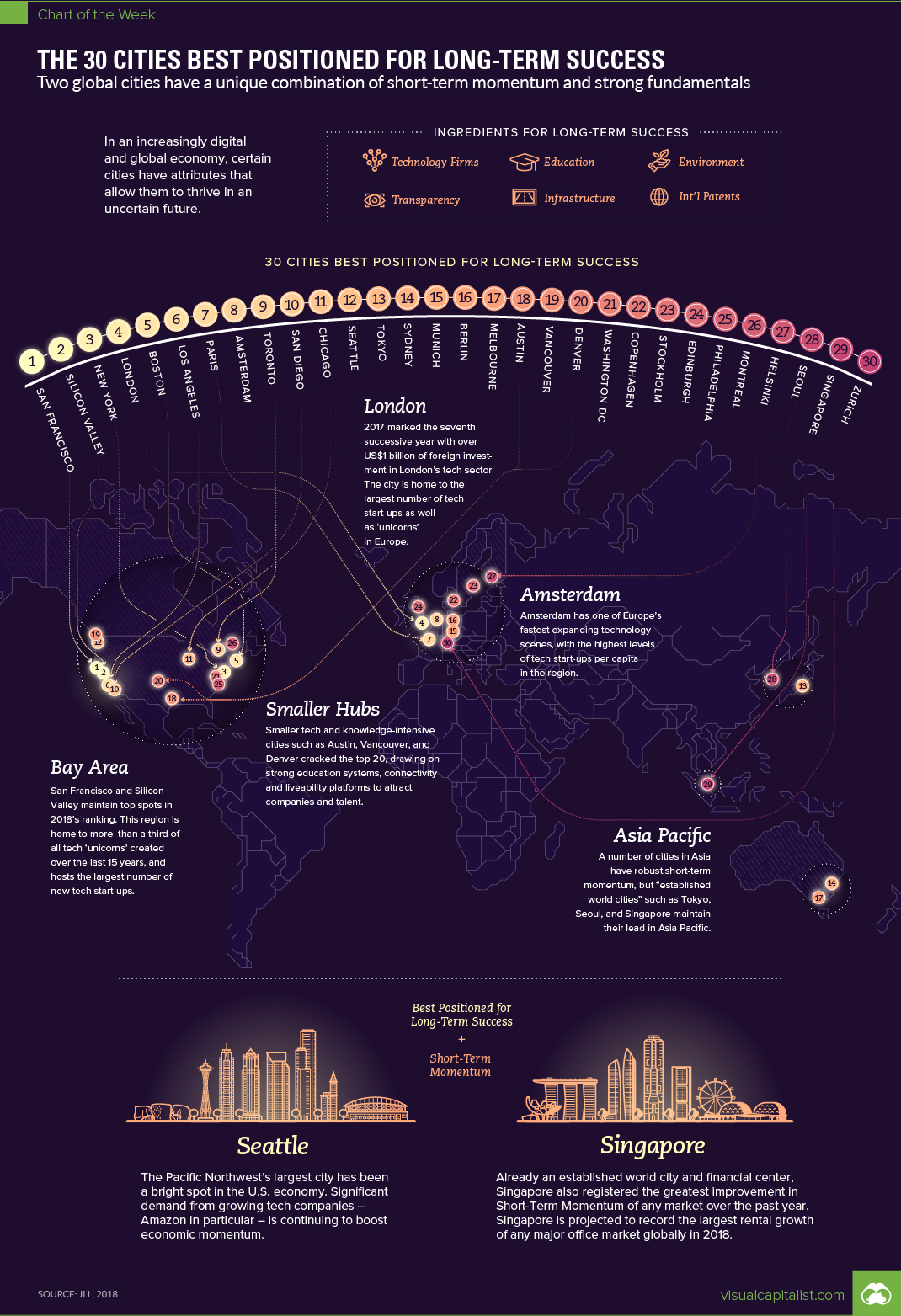 The JLL Index covers 131 major established and emerging markets and tracks a broad range of factors to identify cities that have the strongest short-term socio-economic and commercial real estate momentum, and those that have the future-proofing capacity for longer-term success and looks at key factors such as the number of tech firms, education, environment, transparency, infrastructure, and international patents.