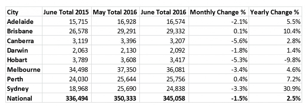 The number of Australian residential property sale listings fell in most capital cities during the month of June 2016, excluding Brisbane and Perth, where sale listings slightly rose.