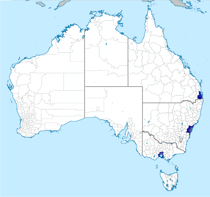 The 3 areas in blue in the graphic below contain roughly 50% of Australia’s population, which means that the area in white contains the other 50%.